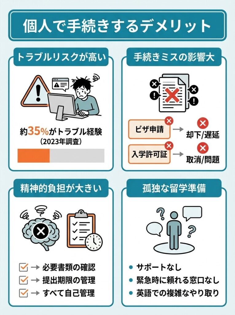 特に多いのが、ビザ申請の手続きミスや、現地校との連絡不足による入学手続きの遅延でしょう。