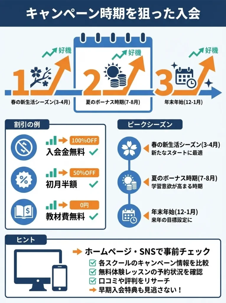 多くの英会話スクールでは、年に数回キャンペーンを実施しています。入会金無料、初月半額、教材費無料など、大幅な割引が適用される場合があります。