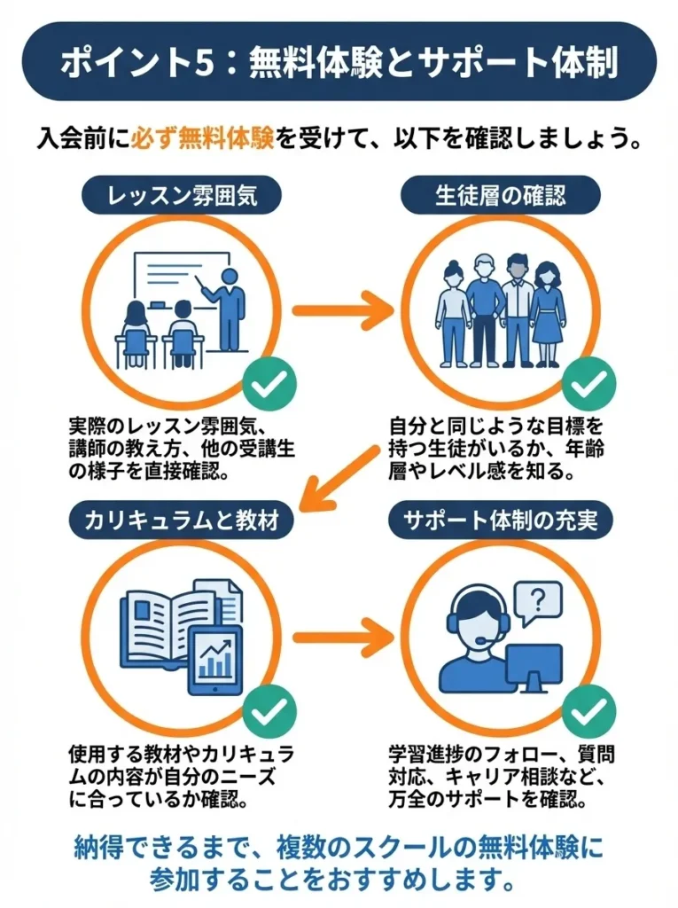 無料体験レッスンを受ける際は、講師との相性や教室の雰囲気をじっくり確認しましょう。他校との比較も大切ですが、自分に合ったスタイルを見極めることが最も重要です。